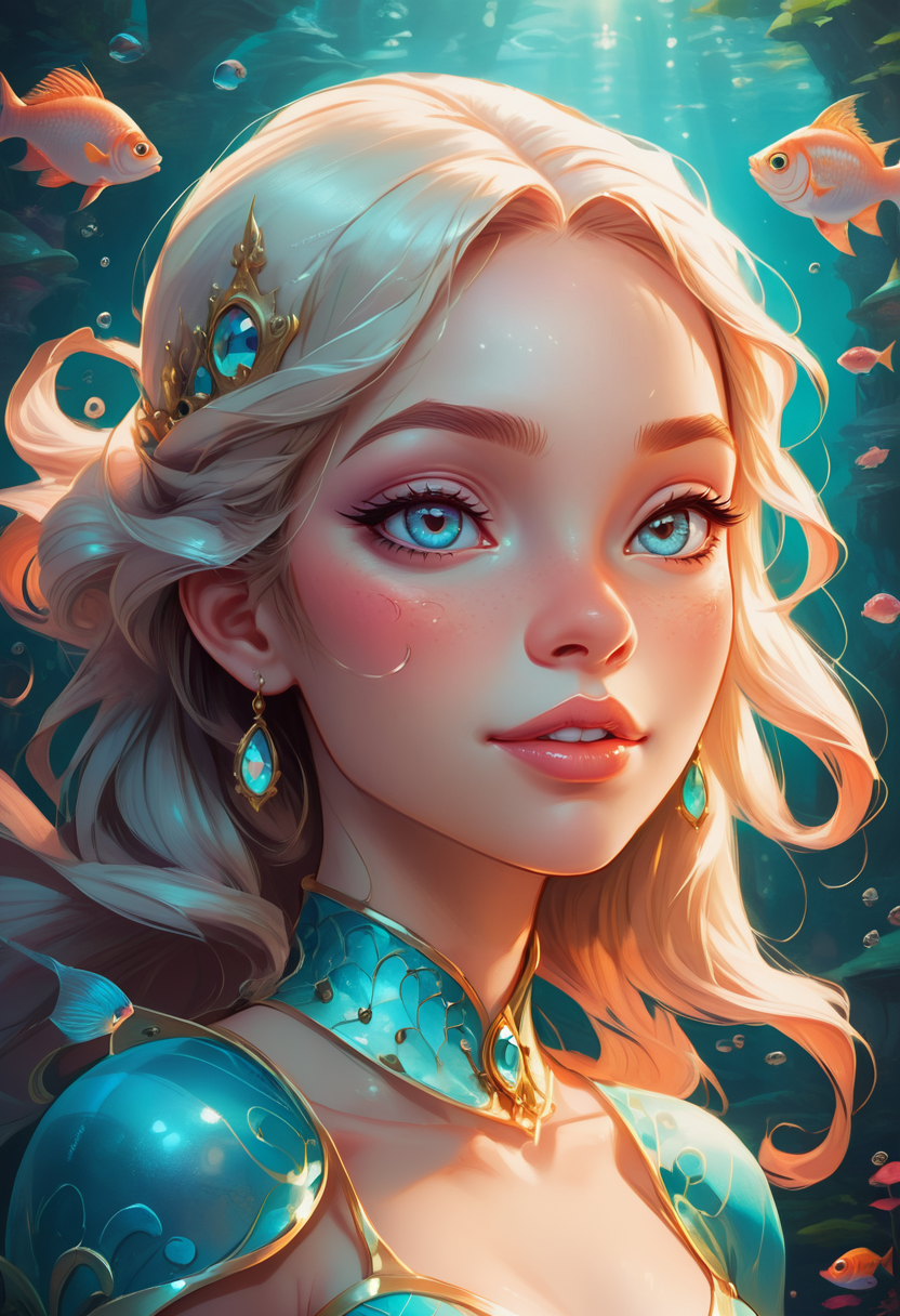 Masterpiece, high quality, stunning composition, highly rated artwork, detailed art, many details, fairytale, storybook detailed illustration, complex background. ((looking at viewer)) fish princess, face closeup, big lips, Amused grin, blunt cut, Dreamlike atmosphere <lora:20250419-1745075667520:0.8>, <lora:SDXLFaeTastic2400:0.6>