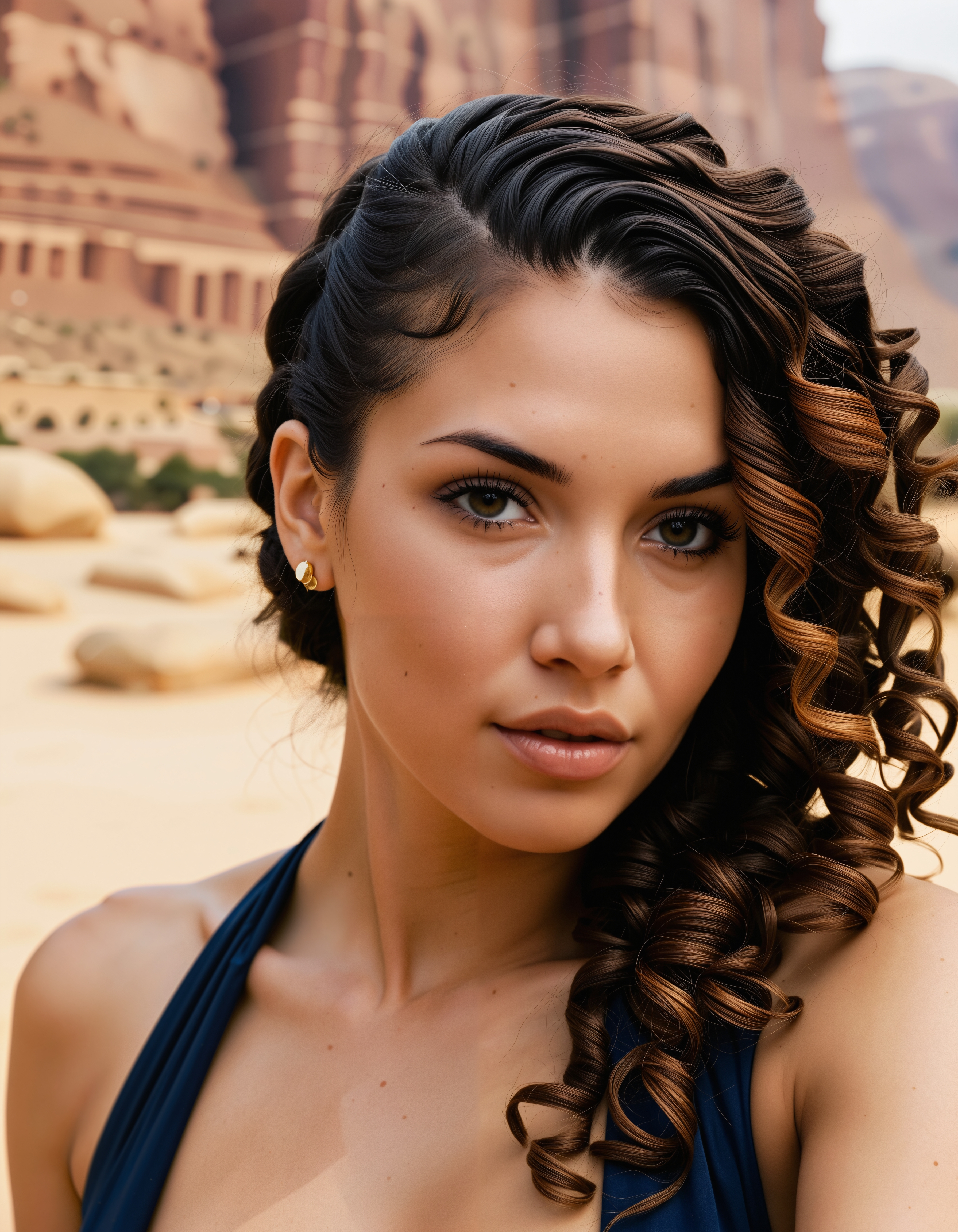 RAW full body analogue photo of a beautiful 25 years old woman, clear focus, high resolution image,,perfect face, sexy pose, wearing Dreamcatcher Tattoo, perfect eyes, detailed eyes, detailed iris, realistic skins absolute perfect tits, soft tits, natural tits, (Twists and Curls hairstyle:1.6),high quality, film grain, Fujifilm XT3, 8k uhd, dslr, film grain, kodak tri-x 400 film, grain photo DOF, faint lighting, dynamic angle, cinematic, Depth of field, bokeh, best quality, cinematic, light particles, highly_detailed, very_aesthetic, golden hour, beautiful_and_aesthetic ,Sexy pose, erotic pose, exhibitionism ,The Petra in Jordan with its rock-cut architecture and desert landscape