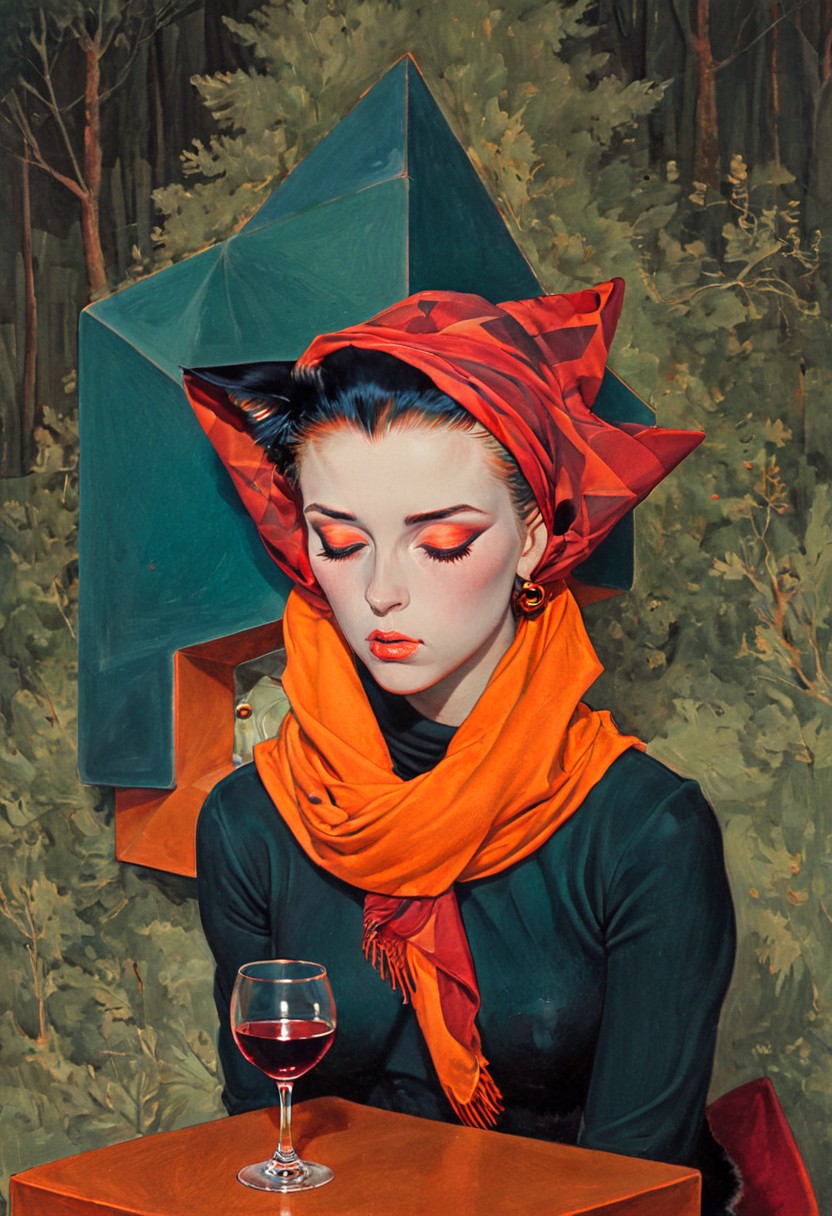 This image is a color pencil drawing in a modernist style, characterized by geometric shapes and vivid contrasts. It depicts a stylized woman wearing a bright orange scarf wrapped tightly around her head, positioned in the center of the frame. Her expression is thoughtful, her eyes closed, with sharp, angular eyebrows and lips colored in deep maroon. To her right, a black cat curls lazily against a cube-shaped chair, blending softly into the background forms. The backdrop consists of triangular and polygonal sections in muted shades of forest green, ochre, and burnt sienna, layered dynamically. A single wine glass sits on a square table near the bottom right, its surface reflecting subtle highlights. The palette emphasizes earthy tones against occasional flashes of vivid orange and deep teal, enhancing the stylized, geometric mood. ArsMJStyle, Colored pencil hyperdetailed realism
