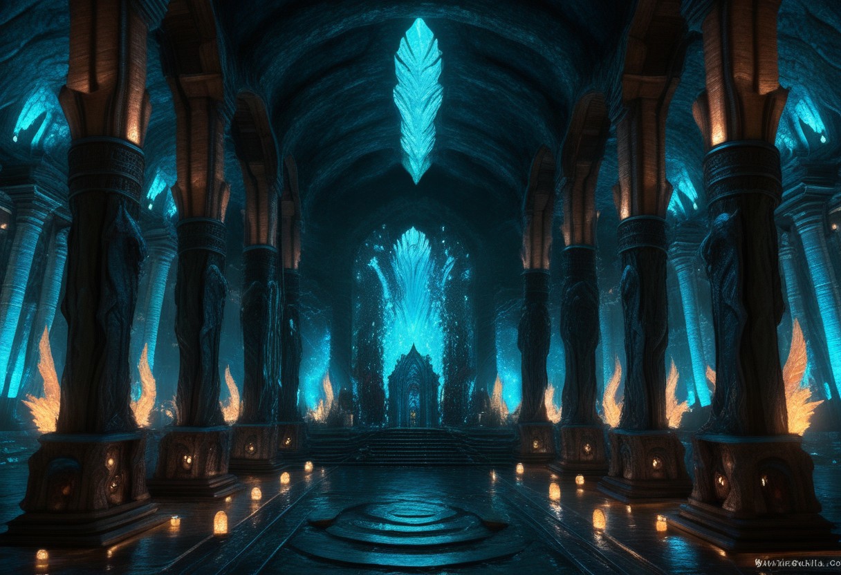 ReptileSkin01_CE_SDXL, epic, masterpiece, highly detailed, absurdres, dwarven mines in (art deco style:1.5), large columns, very tall indoor space, mystical lighting, point light sources, walls made of reptileskin, columns made of reptileskin, decorations made of reptileskin, throne made of reptileskin, forge made of reptileskin, lanterns made of reptileskin, arches made of reptileskin, gates made of reptileskin, pipes made of reptileskin, (glowing light blue:2).
