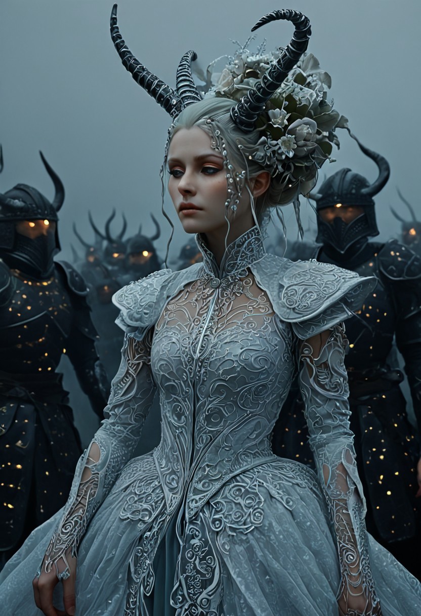 This is a highly detailed CGI illustration in a fantasy art style, depicting a dramatic, ethereal scene. The central figure is a woman with a striking, almost otherworldly appearance. She has an elongated face with a serene, contemplative expression, and her skin has a pale, almost ethereal quality, giving her a ghostly appearance. Her head is adorned with intricate, spiraling horns that resemble those of a mythical creature, tapering to sharp points. Her hair is styled in a high, intricate updo adorned with delicate, flower-like patterns, blending seamlessly with the horns. The woman's attire is equally fantastical, featuring a flowing, ornate gown made of a fabric that resembles ice or frost, covered in intricate, lace-like patterns that shimmer subtly. She wears a high collar adorned with more intricate, flower-like details. The background is a misty, dimly lit scene filled with a multitude of armored figures, suggesting a battlefield or a post-battle scene. The figures are indistinct, their helmets and armor blending into the misty, foggy background, creating a sense of chaos and desolation.