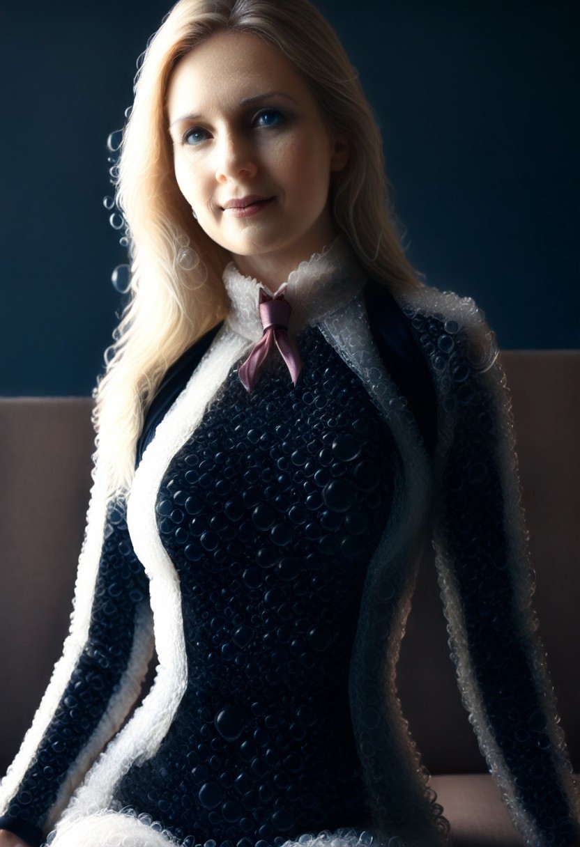 beautiful female, score_9, score_8_up, score_7_up, score_6_up, score_5_up, score_4_up, UHD, 8K, masterpiece, detailed, ultra_high_resolution, lots of detail, OverallDetailXL, detailxl, Masterpiece, 32k, photorealistic:1.4, small waist, fitness body, toned muscles, wide hips, slender legs, high cheekbones, oval face, 32 years old, mature female, milf, makeup, curvy, pretty face, jewelry, solo, seductive smile, sultry, serious stare, stern look, natural skin, long hair, realistic photograph, blond, blue eyes, coffee shop, (formal dress made_of_bubbles:3), (pink tie:1.5), sitting, (high neck closure:2), (fully dressed:2.6), kpop, wrinkles, laugh lines, Mature brunette, (pale beauty:-3)