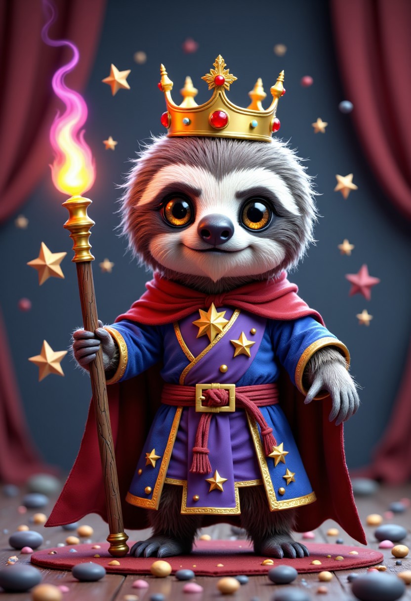 a super realistic3ds max rtx rendered cute sloth king with crown, holding a magic staff and wearing a magic robe. As super hero game character, Poster style Artwork. , aidmaHiDreamStyle