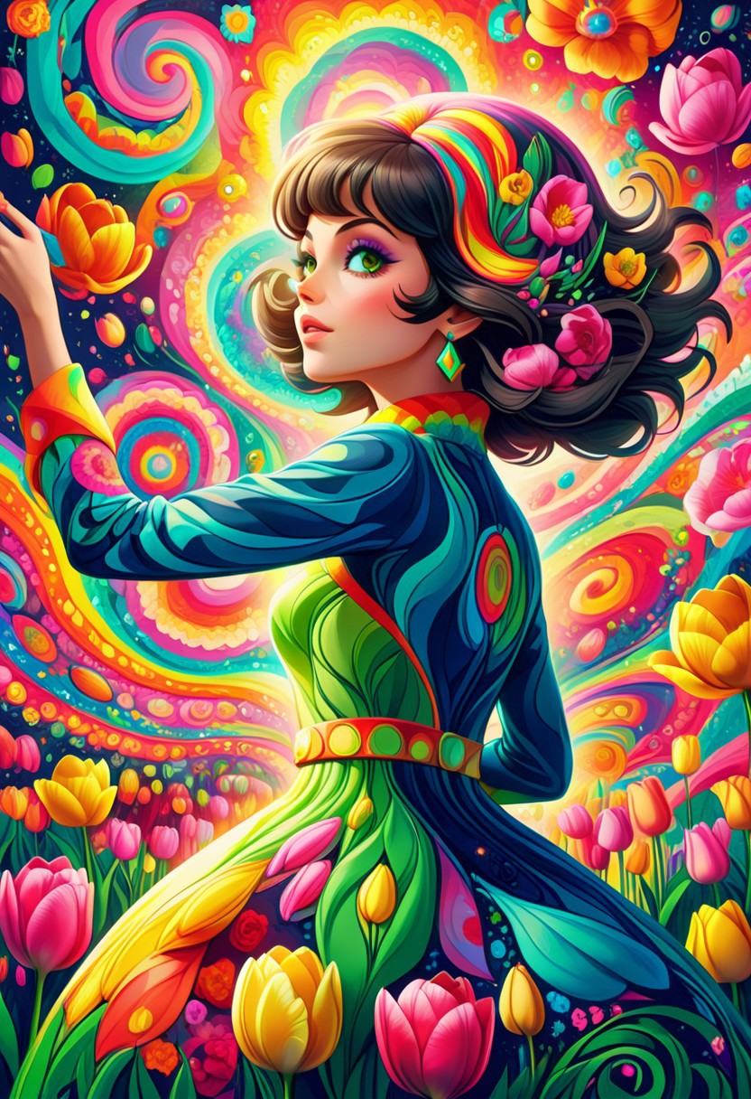 jaynl-tm, Score_9, score_8_up, score_7_up, (masterpiece),(1character), semi side view, (beautiful:1.4), She mod dress, psychedelic swirls made of tulips, vibrant hues, bold patterns, fruit power fashion, swinging sixties, Retro Vogue Cover, kaleidoscopic dreams.,highly intricate, 60s, hyper detailed, photorealistic,