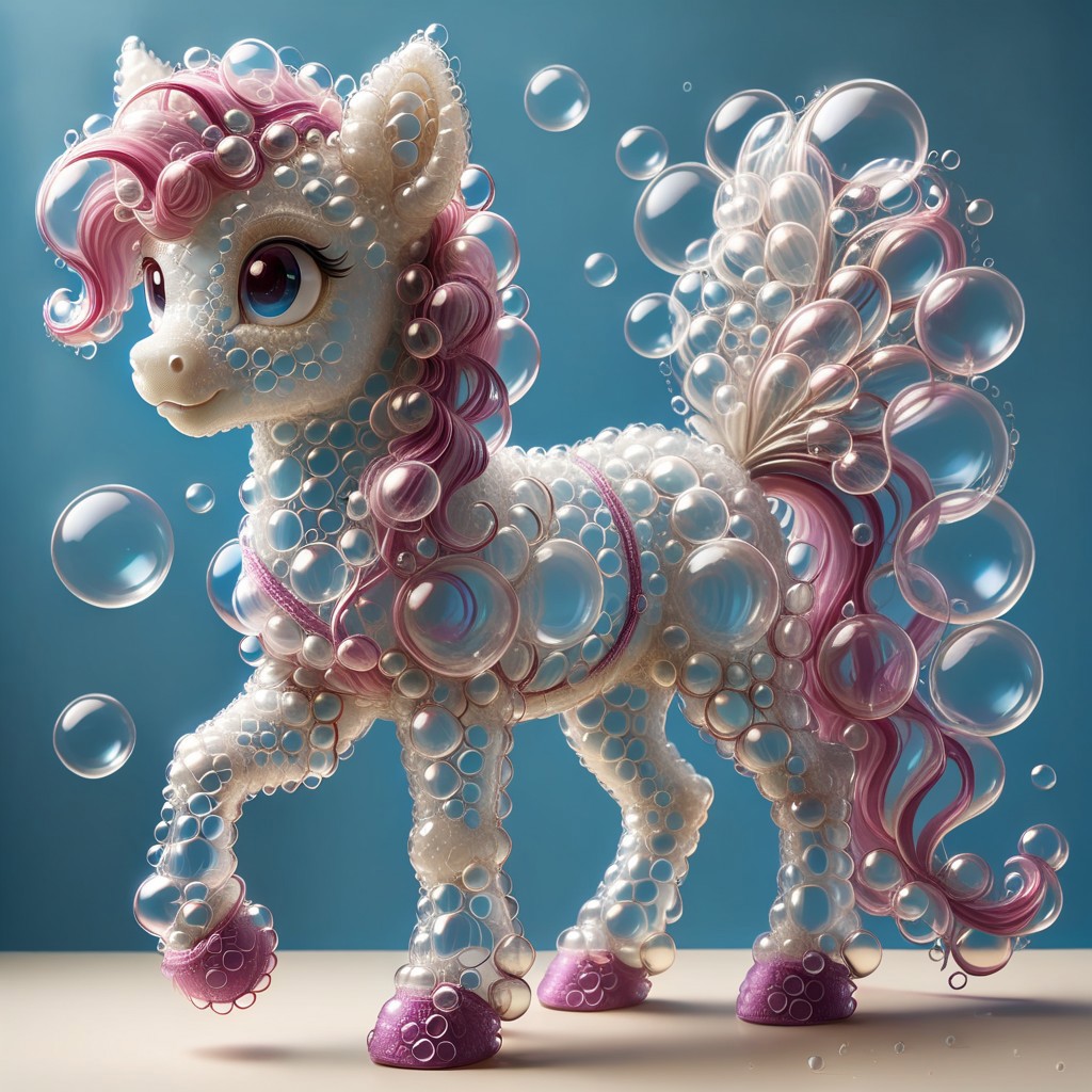 my little pony, made_of_bubbles BREAK Transparent Pony made of bubbles, colorful clear bubbles, curly mane and tail made of thick bubbles, BREAK , whimsical background,