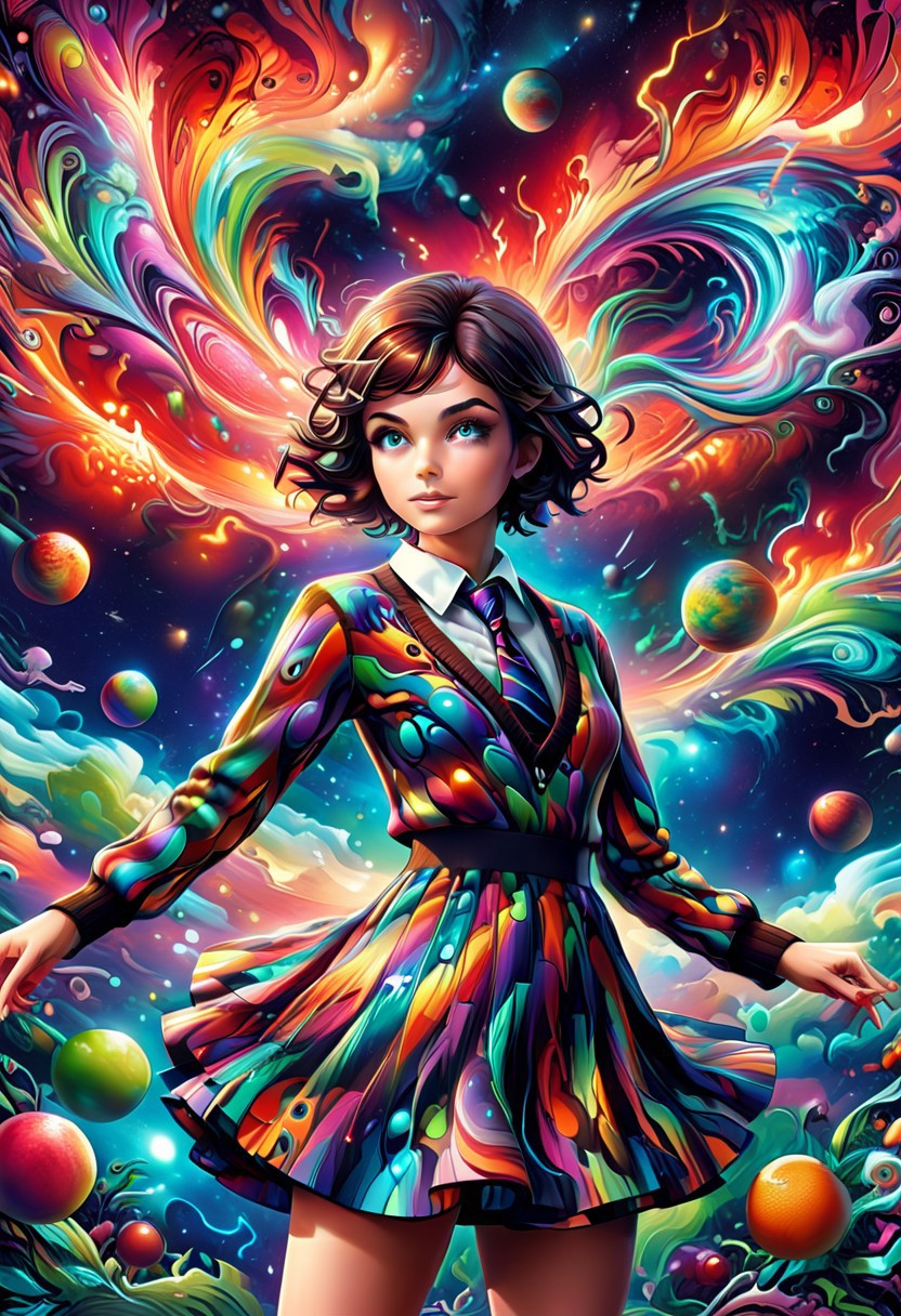 morph-aurora, Score_9, score_8_up, score_7_up, (masterpiece),(1character), semi side view, (beautiful:1.4), She mod dress, psychedelic swirls made lightning, vibrant hues, bold patterns, fruit power fashion, swinging sixties, Retro Vogue Cover, kaleidoscopic dreams.,highly intricate, 60s, hyper detailed, photorealistic, (planet Mars:2), school uniform, white shirt, shirt, collared shirt, necktie, diagonal-striped necktie, sweater, brown sweater, long sleeves, skirt, pleated skirt, black skirt, plaid skirt,