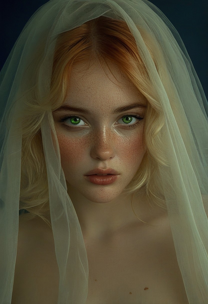 The image is a hyper-realistic CGI artwork featuring a young woman with a striking, ethereal beauty. She has a fair complexion with a scattering of freckles across her cheeks and nose. Her piercing green eyes are almond-shaped and glisten with a subtle sheen, adding depth to her gaze. She has a delicate, heart-shaped face and full, pouty lips painted a vibrant, bold red. Her hair is blonde, cascading down her shoulders and partially obscured by a sheer, translucent fabric that drapes over her face, adding a veil of mystery. The fabric, possibly tulle or chiffon, is a muted beige color with a slightly textured, wavy appearance, creating an ethereal, almost ghostly effect. Her skin appears smooth and radiant, with a subtle glow. Her right hand, delicately posed, cradles her face with fingers extended, emphasizing the softness of her skin and the delicacy of her touch. The background is a deep, dark blue, which contrasts starkly with the light tones of her skin and the fabric, making her the focal point of the image. The overall style of the artwork blends elements of fine art with hyper-realistic digital illustration, capturing a blend of classical and modern aesthetics.