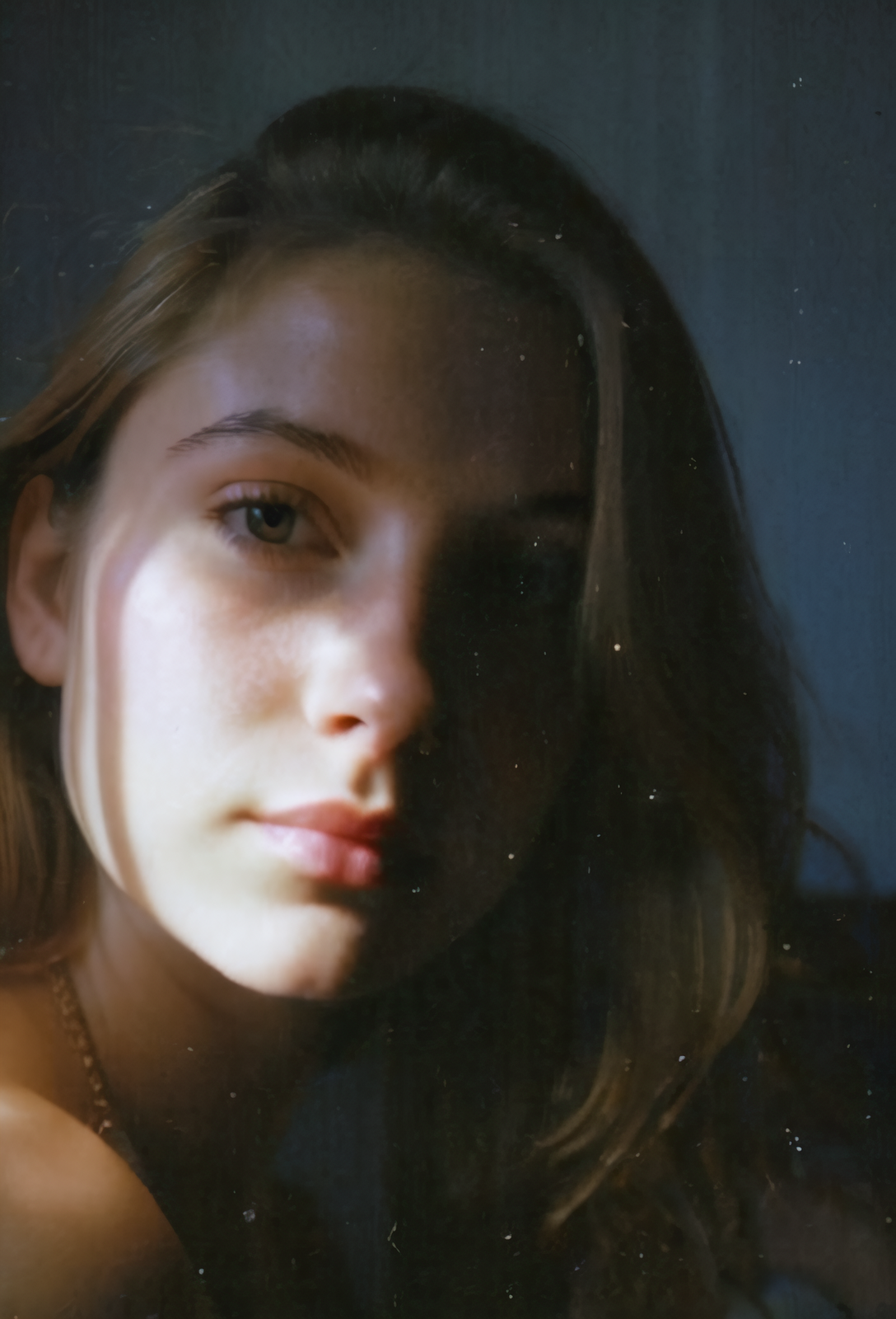 FP100C, Portrait, womans bedroom scene, portrait photo of stylish 21yo Canadian woman, soft facial features, perfect detailed eyes, natural skin, (hard shadows:.81), prismatic light, grainy, shadows, spotlight, sensual, voyuerism <lora:FP100C_frameless:.91>