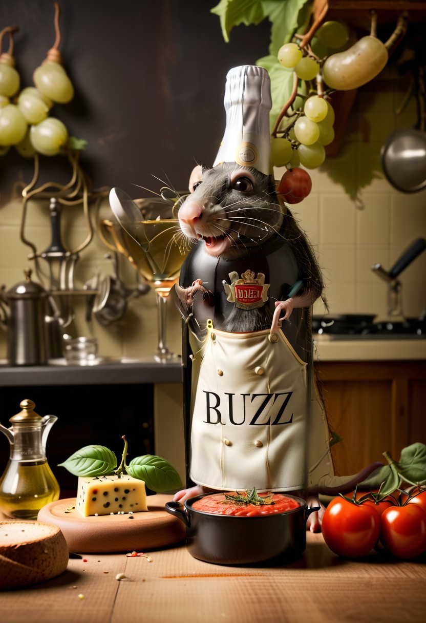 (a cook chef rat like AS Ratatouille:1.3) STAY AT KITTCHEN TABLE WITH CHEESE AND VINE, detailed Luxury style life background, close-up shot, high budgeted Advertising poster of high quality and detail, text "Need buzz".