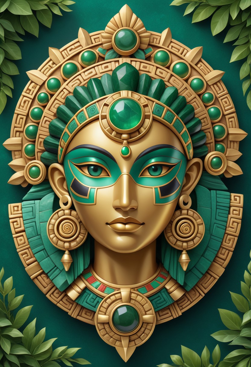 A stunning depiction of a Mayan sun god mask intricately crafted in gold and green jade hues. The mask's symmetrical design features mesmerizing teal gemstones set into its eyes, surrounded by elaborate carvings and patterns representing ancient Mayan iconography. Ornamental details like coiled spirals, geometric motifs, and hanging emerald-green spheres add depth and regality to the artifact. The background highlights lush greenery and symbols of nature, blending cultural spirituality with vibrant natural elements.