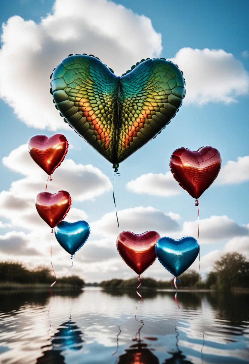 Raw digital photo, rptlsknCE style, a Heart-shaped balloons made of reptile skin patterned, floating in air, glowing interfaces, metallic sheen, cloud,