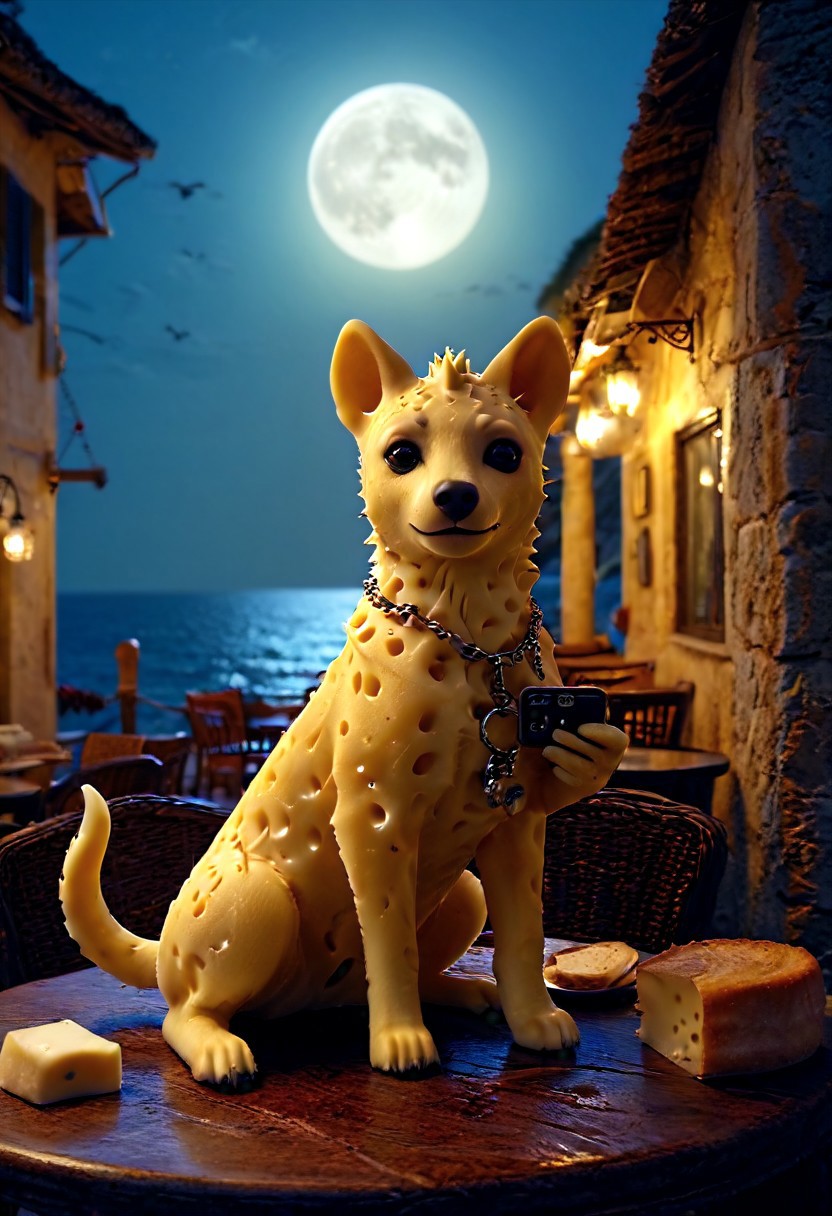 Charming seaside cafe at midnight under a full moon, enchanting atmosphere, 3D render, cream and brown hyena made of cheese carrying a cellphone adorned with an abundance of charms and keychains, beautifully lit, detailed textures, whimsical, inviting ambiance. volumetric, dramatic lighting, best quality, masterpiece, fantasy, beautiful, painterly, detailed, textural, artistic, aesthetic, intricate details, highly detailed, ultra-detailed, absurdres, unreal engine, octane rendering, high saturation, high contrast, vivid, vibrant, volumetric lighting, sharp focus, aid291, midjourneyv6.1, Cheese style