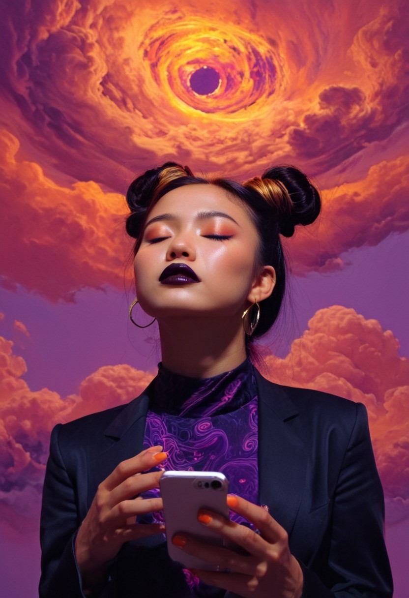 This is a digital art piece with a vivid, surreal color palette dominated by deep purples, oranges, and pinks, creating an otherworldly, dreamlike atmosphere. The subject is a young woman of Asian descent, standing against a backdrop of swirling, cotton-candy pink and orange clouds that appear to be part of a surreal sky. She has a light to medium skin tone, with her hair styled in two high buns on top of her head. Her eyes are closed, giving an impression of deep concentration or contemplation. She wears large, silver hoop earrings and dark lipstick, which contrasts sharply with her pale skin and the vibrant background. She is dressed in a dark, fitted blazer over a high-necked, intricately patterned blouse in shades of red and gold, which adds to the surreal, almost ethereal quality of the image. Her hands, with neatly manicured nails, are holding a smartphone, which she is looking at intently. The lighting creates dramatic, moody shadows and highlights, emphasizing the surreal, almost psychedelic quality of the artwork. The large, glowing sun behind her head, a bright orange orb, contributes to the overall dreamy, fantastical atmosphere of the image.