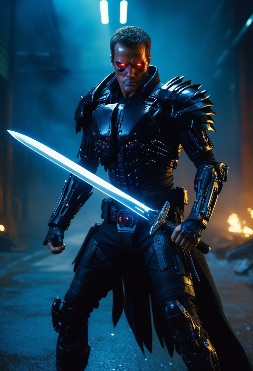 centered, hyperrealism, 3D, CGI render, Cyberpunk Warrior in Dark Armor Wields Malicious Blade, A battle-hardened warrior clad in dark armor grasps a pitch-black blade radiating malevolent energy, surrounded by ghostly apparitions and an ominous aura reminiscent of dark fantasy art, terminator, Cinematic film still, shot on v-raptor XL, film grain, vignette, color graded, post-processed, cinematic lighting, 35mm film, live-action, best quality, atmospheric, a masterpiece, epic, stunning, dramatic, sharp focus, high quality, 32K, follow negative prompts,