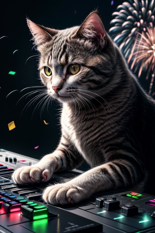 (masterpiece:1.2), (best quality:1.2), highly detailed, realistic texture, sharp details, extremely delicate and beautiful, realistic cg 8k wallpaper Cat DJ with RGB paws, spinning tunes with keyboards, confetti and fireworks, Dark, Moody, Volumetric light, backlight, <lora:add-detail-xl:3> <lora:RGB_Keyboard_themed:1>
