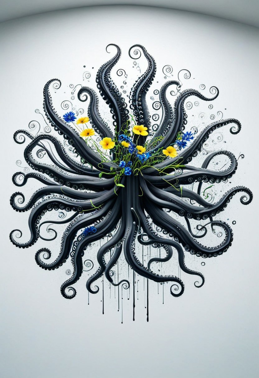 an image of a large spiral staircase, from the staircase 3 floating paths come out that take you to 3 doors located at the end of the path, each door has a different color, yellow, red, green, the staircase has a vine with electric blue flowers, at the bottom of the stairs you see land, at the top of the stairs you see clouds, REAK, RTX_render, 8K, masterpiece, best_quality, ultra_detailed, absurd_resolution, perfect_anatomy, professional In the bottom left corner of the image, a cute cartoon-style octopus is squirting a stream of black ink from its mouth toward a large, clean white wall. The octopus has big round eyes and a playful, slightly surprised expression. The ink splatter on the wall magically forms a beautiful, detailed ink painting of an octopus, as if the real octopus accidentally created an artistic self-portrait. The style of the ink on the wall resembles Asian sumi-e brush art, with flowing lines and dynamic ink wash textures. The background is a minimalist white space, making the contrast between the ink and the wall dramatic and visually engaging. The scene feels whimsical, clever, and slightly magical — blending cuteness, art, and humor in a clean, modern composition.