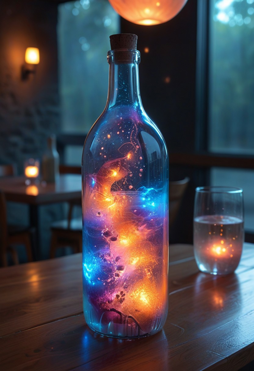 8k, Raw digital photo, lthndrtrl, a bottle and a glowing interfaces glass on a table in a restaurant, filled with liquid made of glow of bioluminescent, ethereal quality environments, glowing particles, minimalist, dark background,