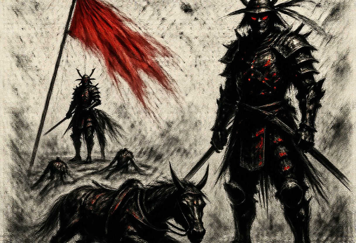 d3press1on, Grey scale masterpiece of contemporary art, selective colorfull, intricate scene, samurai in samurai armor standing beside fallen camerad, silent mouring, background battelfield after lossfull samurai fight, many dead bodies ob battlefield, a horse laying on side, red colored torn loose banner half errect on meaningless hill blowing in wind
