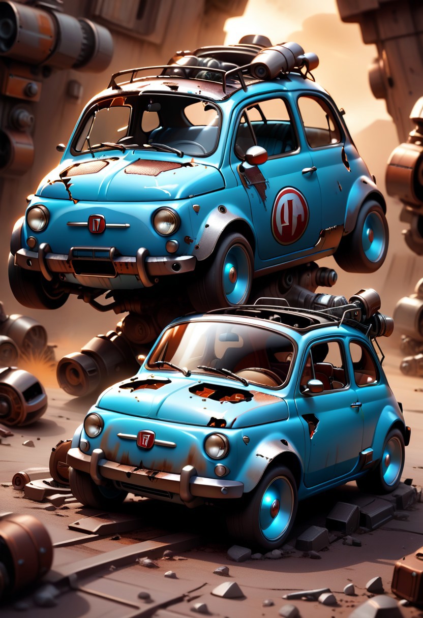 Highest quality, (masterpiece:0.5), dynamic angle, dark glowing, chibi skyblue fiat500 logo, damaged and reveal the rugged beauty of mechanical life, dvr-rst,