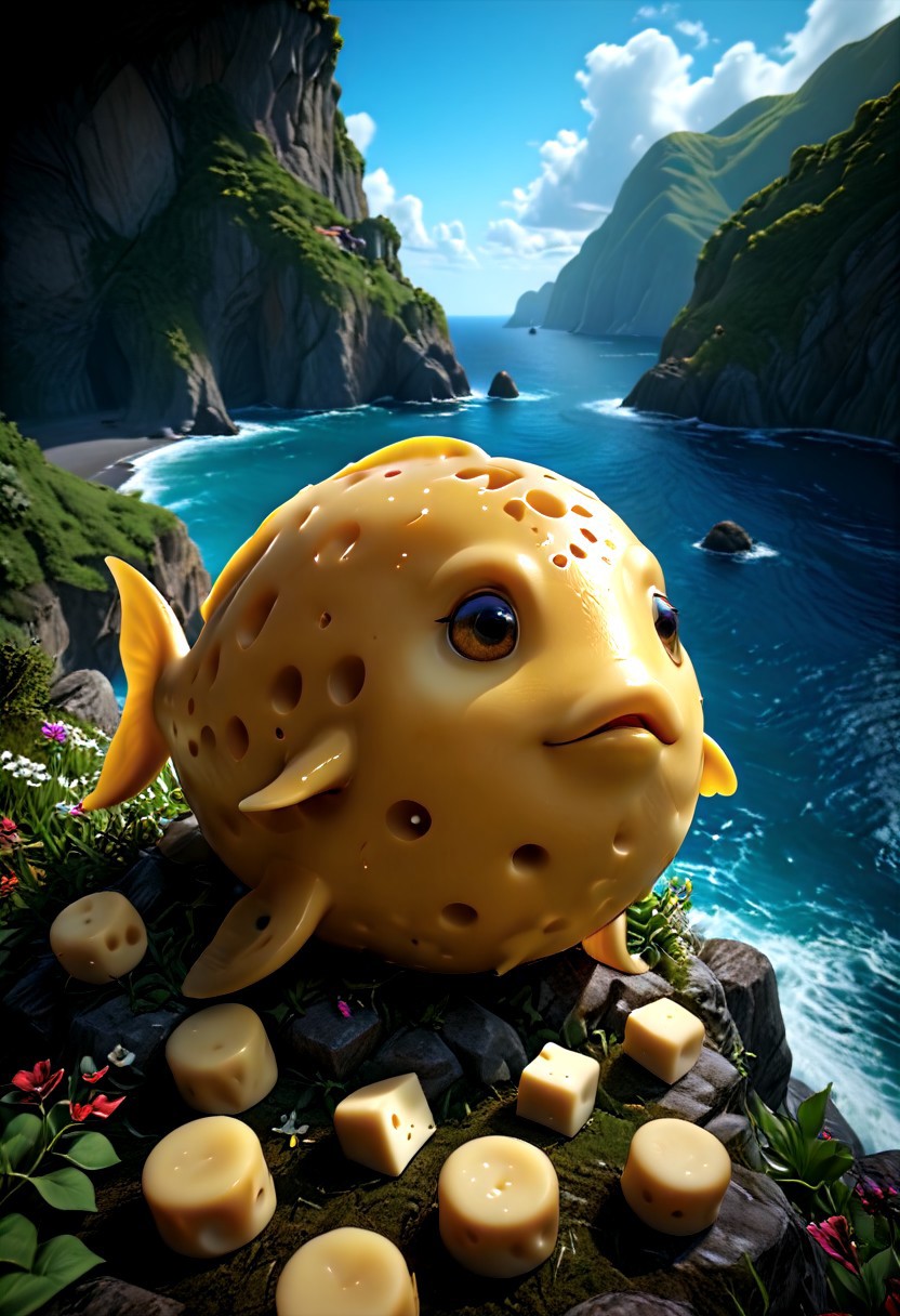 A stunning 3D render of a scenic coastal cliff, under a lively atmosphere with vibrant weather, featuring an enchanting feel. In the foreground, an obscenely bright yellow blobfish made of cheese with heterochromia, intricately detailed, showcasing textures and lighting that enhance its surreal appearance, masterpiece by high-quality 3D artists, 8k resolution. volumetric, dramatic lighting, best quality, masterpiece, fantasy, beautiful, painterly, detailed, textural, artistic, aesthetic, intricate details, highly detailed, ultra-detailed, absurdres, unreal engine, octane rendering, high saturation, high contrast, vivid, vibrant, volumetric lighting, sharp focus, aid291, midjourneyv6.1, Cheese style