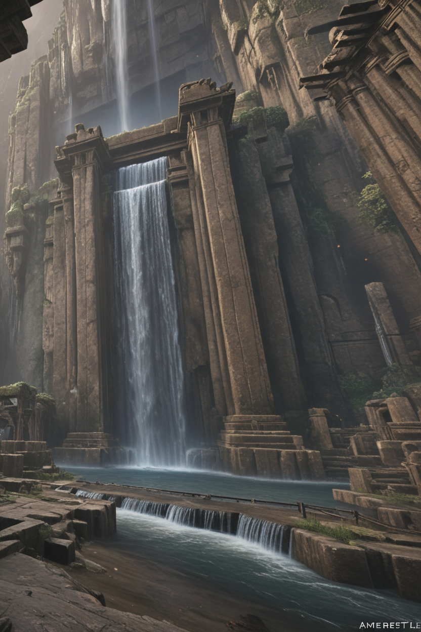 perfect lighting, masterpiece, realistic, albrecht, fantasy, waterfall, ancient tech ruins, scenery, cinematic photography <lora:albrecht_labs:1>