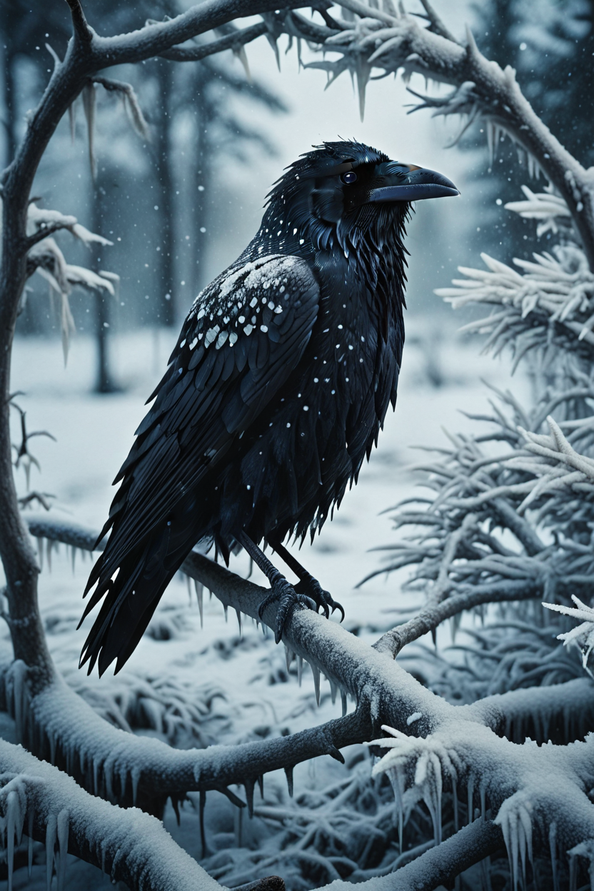 fr0stwrld, snow, ice, raven on a branch,, cinematic photography <lora:Fr0stWrld4:1>
