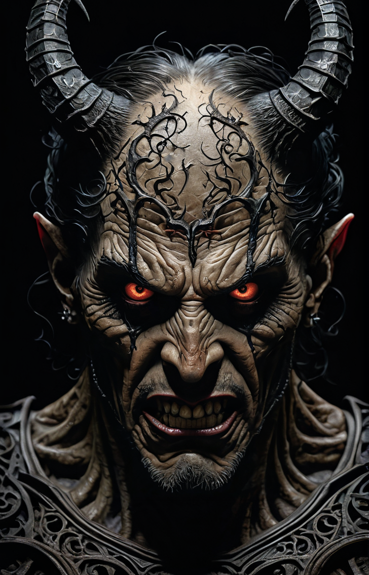 by Elias Goldberg, (otherworldly, dark palette, highly professional, dramatic lighting, extremely beautiful:1.4), (intricate details, masterpiece, best quality:1.4), Lovecraftian horror, eldritch, cosmic horror, unknown, mysterious, surreal, highly detailed, looking at viewer, dynamic pose in the style of Nicola Samori, Horror-themed (8k, RAW photo, highest quality), hyper realistic, intricate abstract, intricate artwork, abstract style, hauntingly, dark and haunting portrait of a demonic satan emerging from the shadows, exuding terror, sinister eyes piercing through the darkness, intricate details, menacing expression, muted colors, Eerie, unsettling, dark, spooky, suspenseful, grim, (in the style of ian miller:1.3), highly detailed, (intricate details), hdr, (intricate details, hyper detailed:1.2), cinematic shot, extremely high-resolution details, photographic, realism pushed to extreme, fine texture, incredibly lifelike