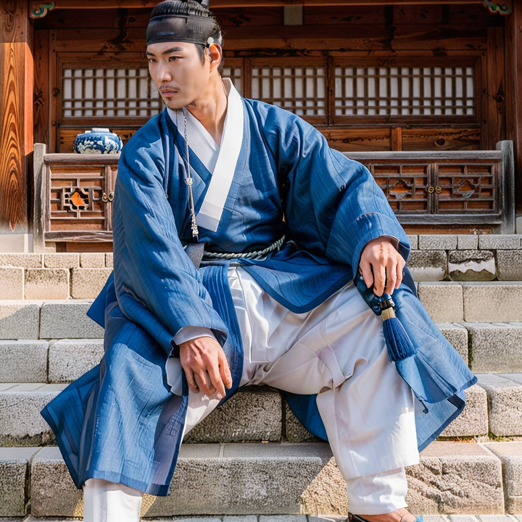 safe_pos, perfect anatomy, perfect proportions, best quality, masterpiece, high_resolution, high quality, solo focus, male focus, male only, bara, mature, masculine, manly, rugged, handsome, alluring, seductive, heroic, cowboy shot, dutch angle, look at viewer, asian male, Korean male, dark eyes, dark hair, facial hair, stubble, Korean clothing, male Hanbok, jungchimak\(Korean clothing\), blue jungchimak, blue Hanbok, closed clothes, side-knot closure clothing, single side-knot, sangtu hair\(korean topknot\), topknot, manggeon\(Korean headband\), black headband, no_hat, no_chin_strap, bare chin, bare jawline, baji pants \(Korean clothing\), white pants, kkotsin\(footwear\), outdoor, korean architecture, hanok,