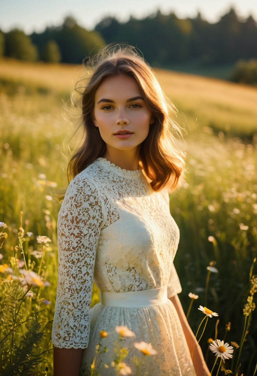 poster image, half body, 1girl, 1960's style, Mod Fashion Icon, Shadow art, atmosphere of neon lights, romance, fairytale, bathed in the soft, warm glow of natural light, She stands among a meadow of wildflowers, with sunlight streaming through, high ISO and long shutter speed, Add subtle imperfections from jpg compression artifacts, nostalgic vibe, bokeh effects, 4K resolution