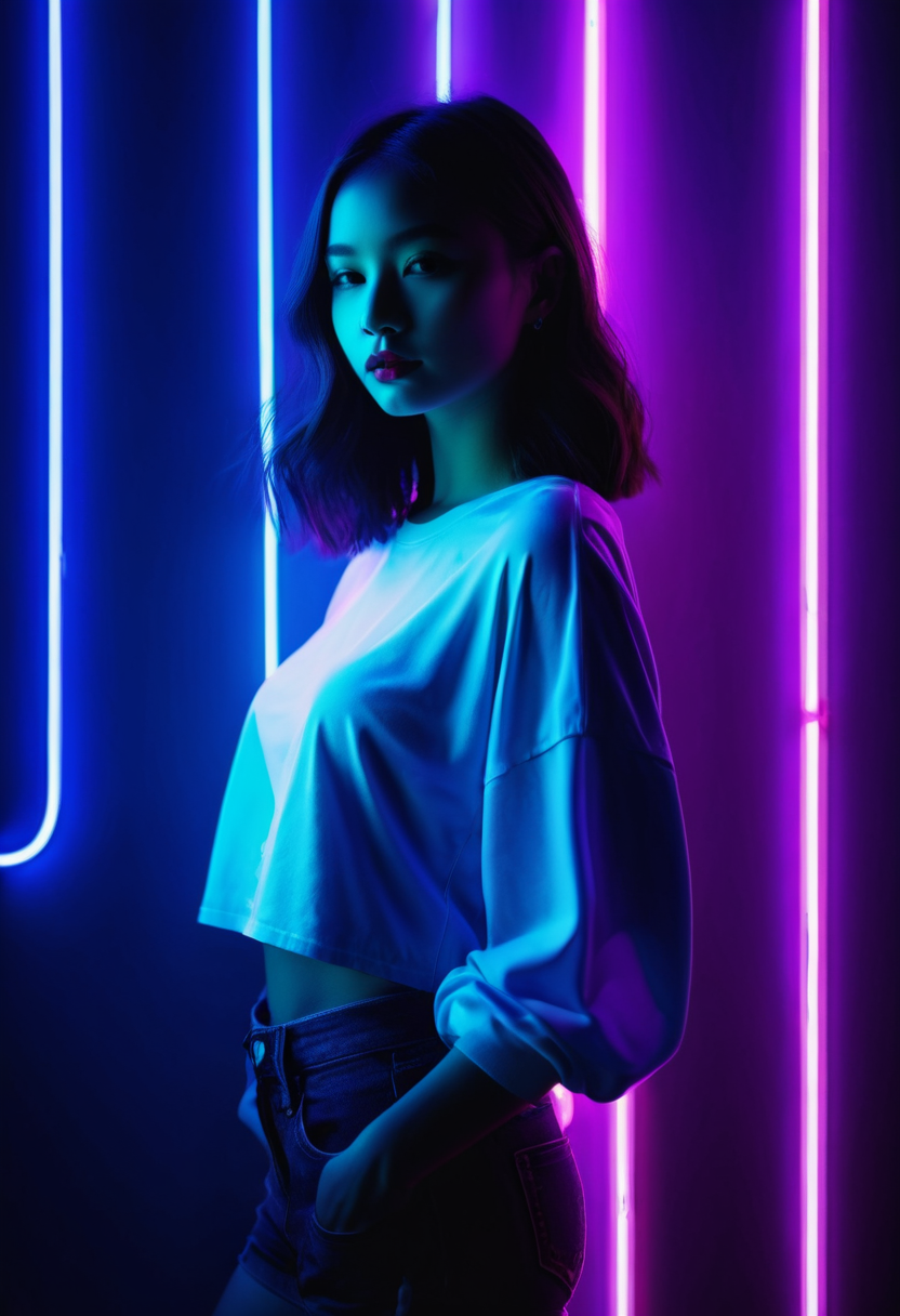 poster image, half body, 1girl, Shadow art, full-length shot of girl at 25 years old, atmosphere of neon lights