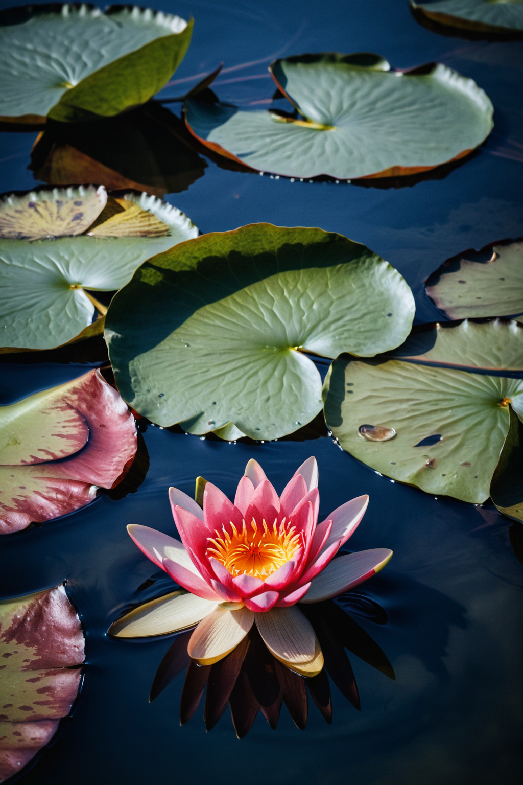 (masterpiece, best quality, highres, realistic), photo by Melissa Stemmer, red lotus water lily blooming on water surface and dark blue leaves toned, purity nature background, aquatic plant, symbol of buddhism., breathtaking photograph, <lora:melissa-stemmer-1.0:1>, cinematic look, minimalistic, blurred background, warm atmosphere, daylight, professional color grading, simple look, unedited photography, natural, unassuming, simple style, award-winning, stunning, kodachrome, vintage look, vibrant colors, <lora:add-detail-xl:2>