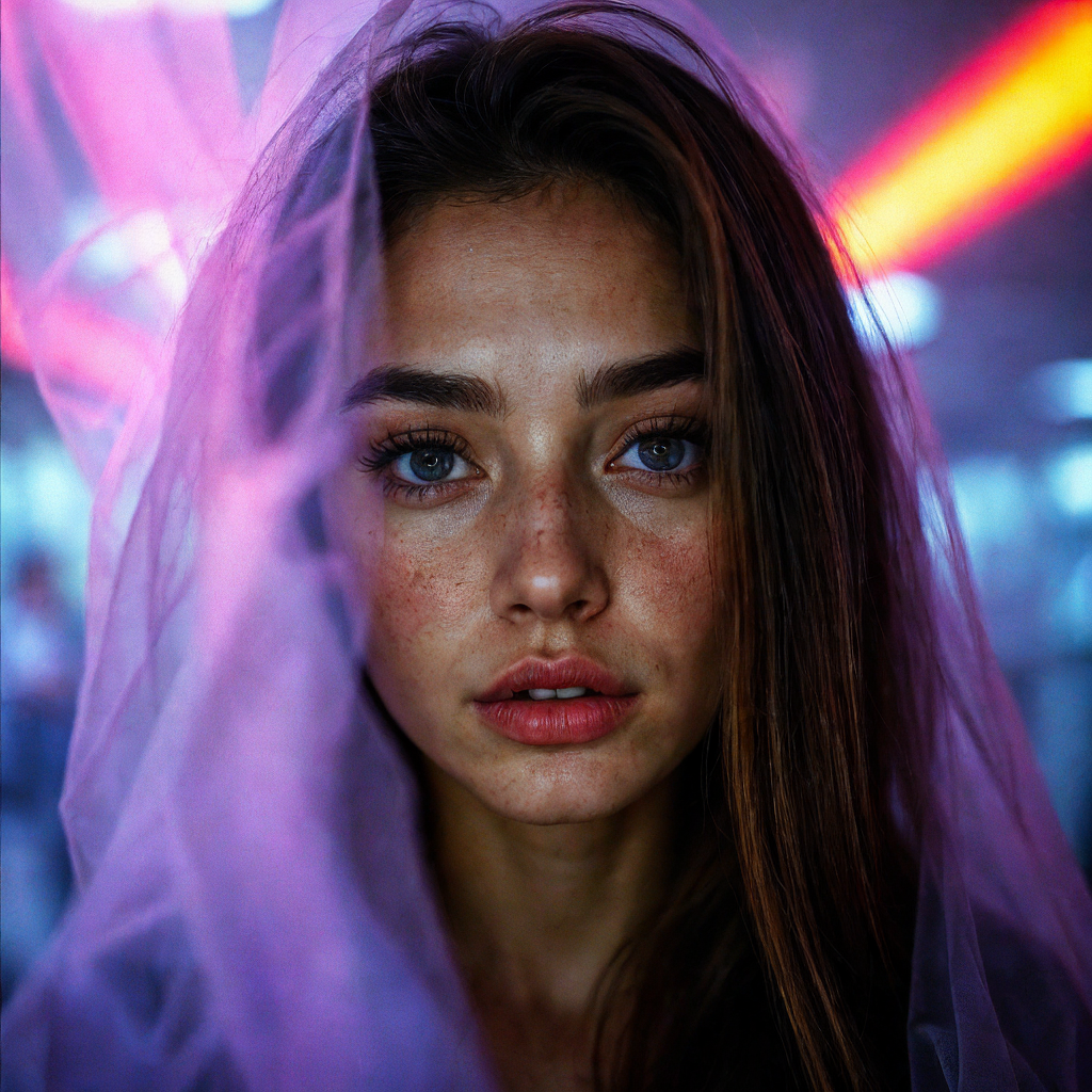 25 years old woman shoot RAW photo, wide angle illuminated by studio lighting, highly detailed skin, captured with Cinestill 800T, ensuring a photorealistic depiction., RAW candid cinema, 16mm, color graded portra 400 film, remarkable color, ultra realistic, textured skin, remarkable detailed pupils, realistic dull skin noise, visible skin detail, skin fuzz, dry skin, shot with cinematic camera . Blurred motion, streaks of light, surreal, dreamy, ghosting effect, highly detailed