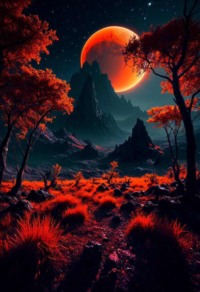 surreal scifi theme, Landscape of an unknown planet, Night, red planet on a black sky. Deep orange, deep black, high contrast, bright colors,.Black glossy obsidian trees, field of tall orange grass, stars, atmospheric, Max Details, sharp focus, high contrast, stylized, dark, clear, surreal, ultra quality, 8k, best quality, masterpiece, midjourneyv6.1, colorful