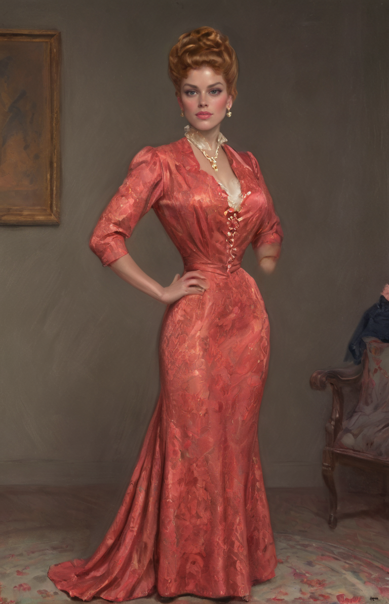 1boy, 1girl, masterpiece, 4k, uhd, dynamic action, (Women are tall with good posture. Women have an arched back and small ass, women are haughty, women are elegant, women are superior, women are beautiful with high and prominent cheekbones, women have beautiful natural warm skin tones and long and luxuriant (blonde:auburn:0.3) hair, Women are slim with massive breasts. Women wear fitted Edwardian jacket dresses and narrow skirts. Women are hale and hearty and mirthful. Women have full lips and a slight sneer,:0.9) Men are tiny and short, men are sniveling and nervous, men have short hair and timid expressions. The scene is moody, (the dominant color being the bright red color of the woman's lips:0.7). an oil painting by Charles Dana Gibson. (An elegantly dressed, very tall and haughty young Gibson Girl in a palatial room:1.3) <lora:hand 4:1>hand <lora:Gibson_XL:0.3> by g1bs0n <lora:Belle_Epoque_Dresses_1880-1914_XL:0.4> frilly silk and rich brocade 1900_dr3ss <lora:officialpit_style_xl_ilff:0.8> big breasts, dark-skinned male, interracial, female focus, high heels