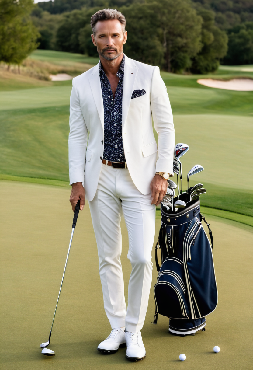 raw photo, full body, beautiful man, 40 years old, Classic Fashion, plays golf, luxurious outfit