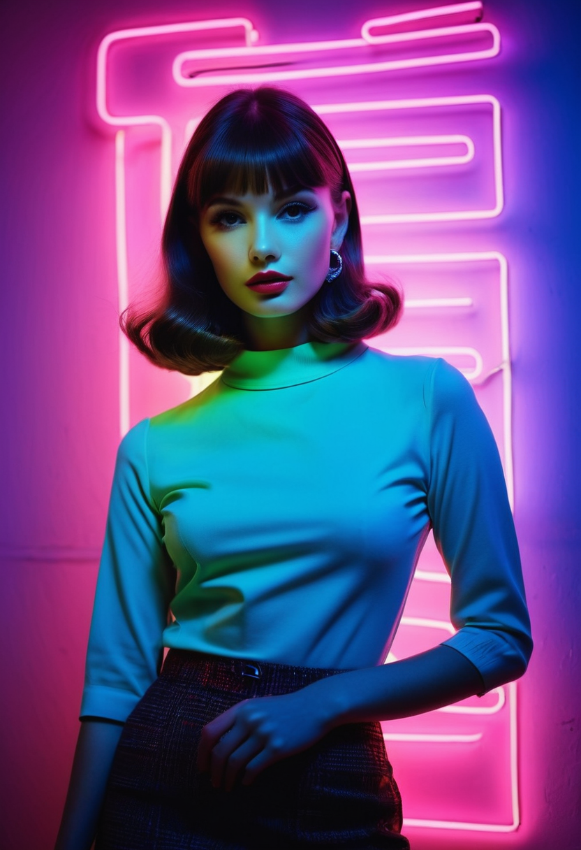 poster image, half body, 1girl, 1960's style, Mod Fashion Icon, Shadow art, full-length shot of girl at 25 years old, atmosphere of neon lights