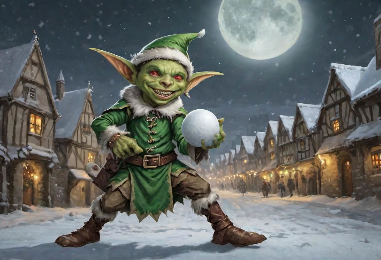 fantasy d&d image of a boy path_goblin, wearing a green Christmas elf outfit, holding a snowball, medieval city, big full moon , nocturnal image, snowball fight,