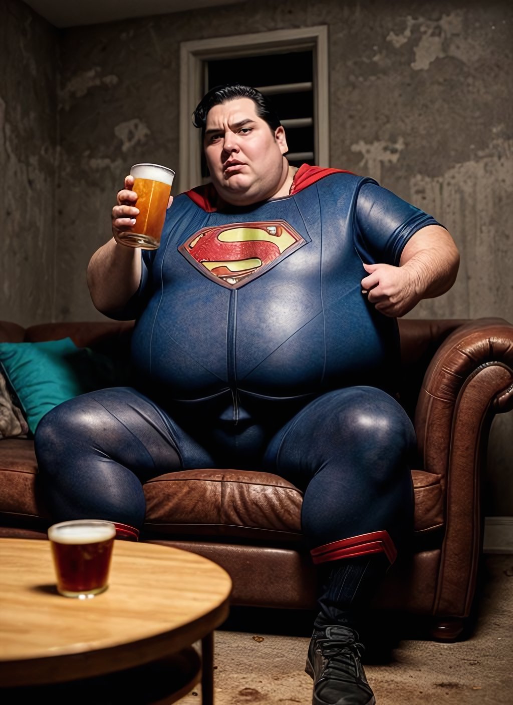 score_9, score_8_up, score_7_up, score_6_up, score_4_up, (very fat:1.4), superman, terrible, drunk, drinking beer, sad, tired, angry, Sitting on the couch, batman clothes, An abandoned room with scuffed walls, ultrarealistic, realistic lighting, sharp focus, <lora:more_details:0.3>