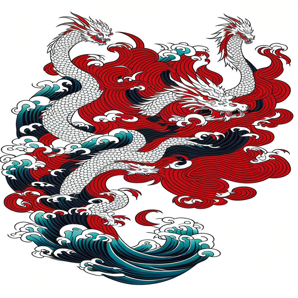 irezumi tattoo art style on a white background, a traditional Japanese dragon with rich reds, golds, and deep blues color, coiled around cherry blossoms flower, cherry blossoms flower pattern background, ocean waves, stylized clouds,dynamic composition <lora:realistic_irezumi:0.6>
