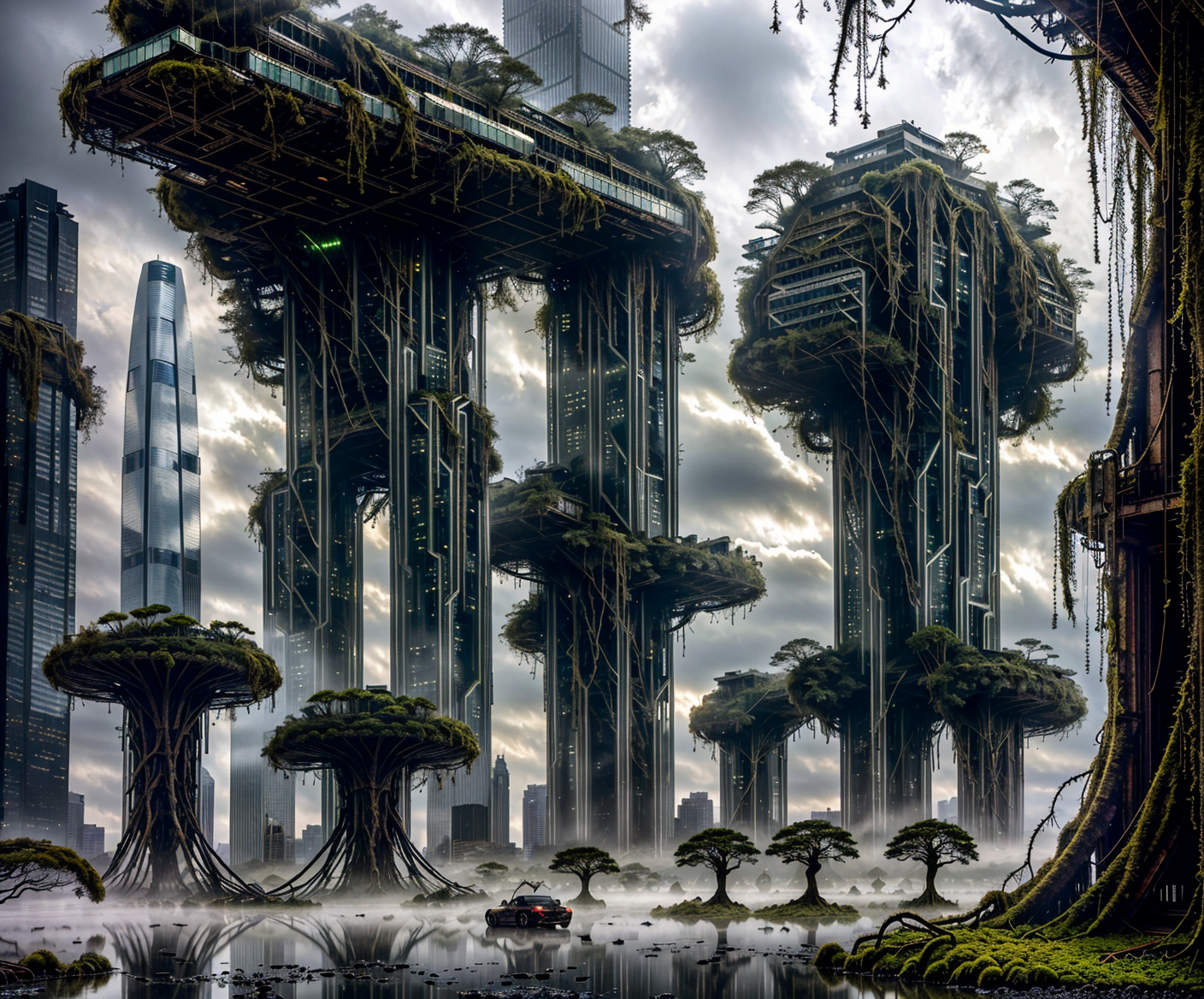 "An abandoned futuristic city slowly reclaimed by nature, colossal sci-fi skyscrapers crumbling under the weight of massive, twisted vines and glowing bioluminescent plants. Cracked metallic structures covered in moss, shattered glass towers overtaken by enormous tree roots, alien flora blossoming through rusted machinery. Mist floats between the ruins, casting ethereal light beams through broken ceilings. Hyper-realistic textures: oxidized metal, damp stone, glistening foliage, reflective water puddles. Wide-angle cinematic view, deep atmospheric perspective, extreme detail, hyperrealism, hauntingly beautiful mood."