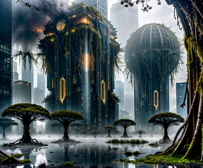 "An abandoned futuristic city slowly reclaimed by nature, colossal sci-fi skyscrapers crumbling under the weight of massive, twisted vines and glowing bioluminescent plants. Cracked metallic structures covered in moss, shattered glass towers overtaken by enormous tree roots, alien flora blossoming through rusted machinery. Mist floats between the ruins, casting ethereal light beams through broken ceilings. Hyper-realistic textures: oxidized metal, damp stone, glistening foliage, reflective water puddles. Wide-angle cinematic view, deep atmospheric perspective, extreme detail, hyperrealism, hauntingly beautiful mood."