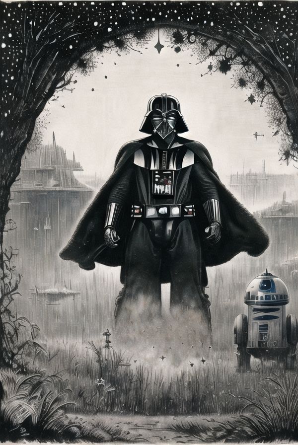 (((early 20th century ink drawing of star wars in the style of norman lindsay))), black and white, masterpiece, best quality, highly detailed, professional color grading, film grain, atmosphere, wondrous, 8k resolution, hyper realistic,