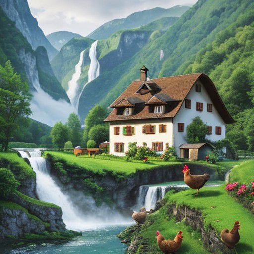 farm with hen and house in the country of Switzerland with waterfall background