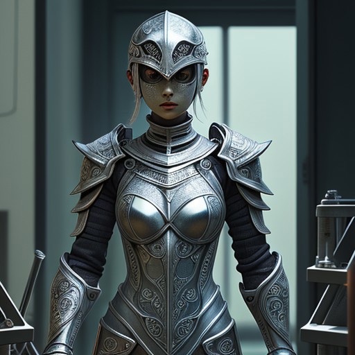 MetalNGems, 1girl, silver armor, intricate designs, wrench, screws, shiny, reflection, candid setting