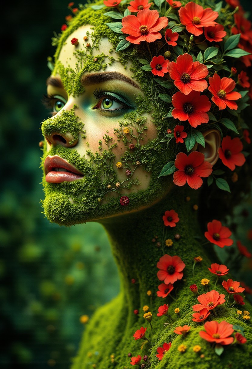 masterpiece, best quality, A hyper-realistic Close up shot of a figure completely made of grass and red flowers in female form, full body zoomed in, ultra sharp focus photo, 3d render, architecture, dark fantasy, vibrant (photography, high-resolution, dynamic, energetic,hyper-realistic, dramatic lighting, shallow depth of field.), dramatic lights, Cinematic, beautiful, vibrant, masterpiece, 32k, ultra HD, ultra-detailed, amazing quality, amazing artist, sharp edges, detailed textures, full view, atmospheric lighting, amazing visuals