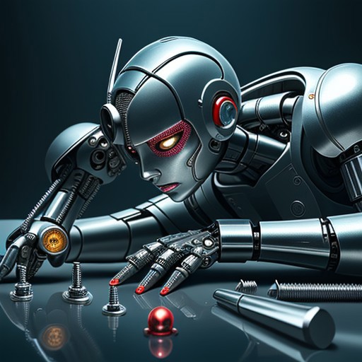 MetalNGems, android, cyborg, intricate designs, wrench, screws, shiny, reflection, candid setting