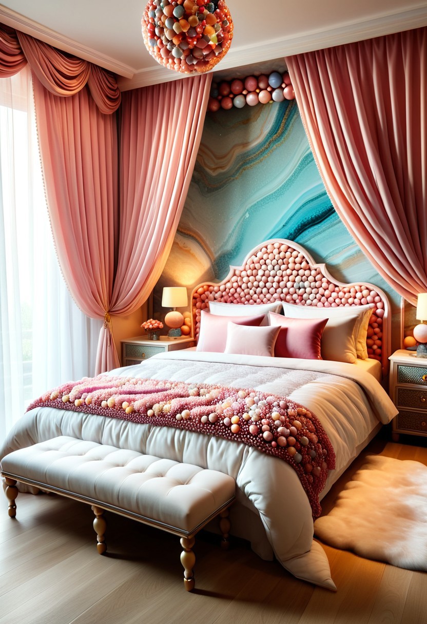 (((reality-shot, realism, realistic photography of a cozy bedroom interior decorated with marbles, bedframe crafted from interwoven glass spheres, pillows stuffed with cloud-like stuffing dyed soft translucent hues, curtains draped over hooks shaped like marble swirls, cozy art style, pearl-pink theme, intricate details, ultra sharp, exquisite detail, flawless composition, vivid colors, masterpiece, comforting sanctuary lora:marbles_world:1 )))