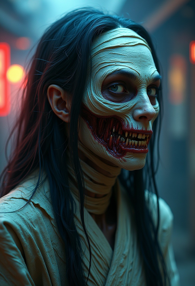 Create a stunning hybrid creature of Mummy and Futakuchi-onna, with intricate details, dynamic lighting, and a cinematic atmosphere. Combine the ancient, bandaged appearance of a mummy with the eerie, long-haired, two-mouthed features of Futakuchi-onna. Utilize vibrant colors and dramatic lighting to enhance the visual impact. This image should be a captivating blend of horror and beauty, with a focus on precise anatomy and attention to detail.