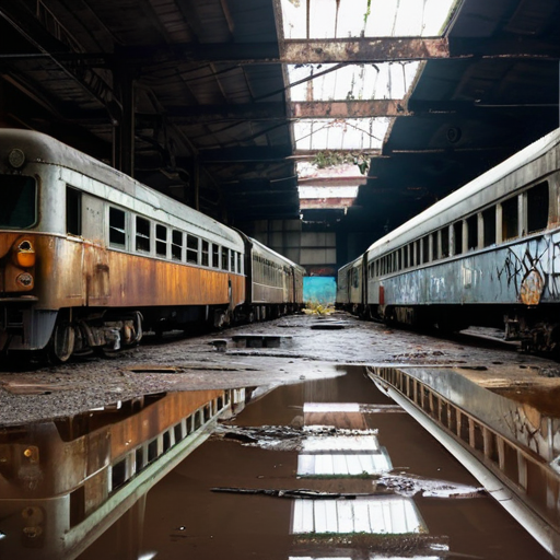 abandoned train depot with leaking roof, large puddles on the cracked concrete floor, rusted electric locomotives from the 1970s covered in dust and graffiti, wet metal surfaces reflecting dim natural light, broken overhead lighting, shattered windows letting in grey daylight, overgrown vegetation creeping inside, photorealistic, high detail, moody atmosphere, water dripping from ceiling, cinematic composition, ultra-realistic, 35mm lens, depth of field, wet surfaces, HDR, sharp textures, damp smell vibe