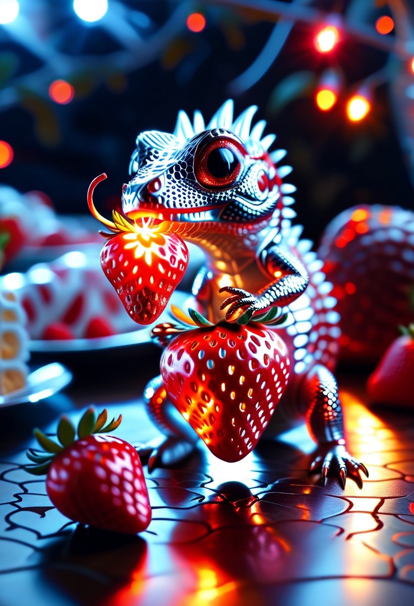 tiny lizard made of l1qu1dp34rl and aluminum foil, trying to eat a giant glowing strawberry, ultra-detailed snack confusion, silly wonderland lighting